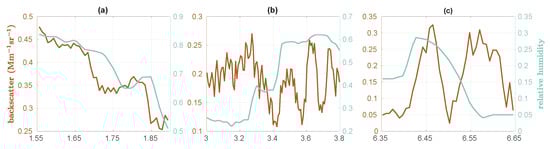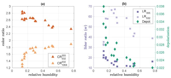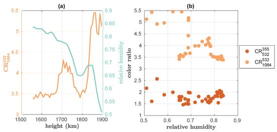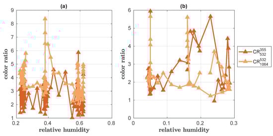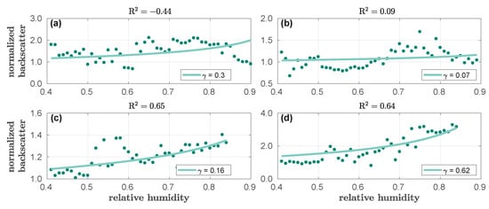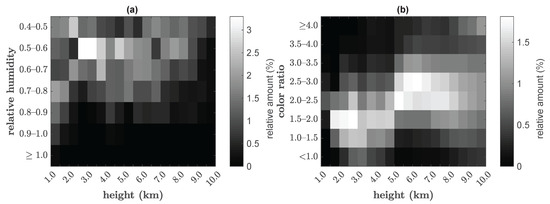 - No clear trend in the hygroscopic growth with regard to the aerosol diameter could be observed. This probably resulted from its strong dependence on the aerosols’ geographical location and altitude, or even the development of backscatter with the particle radius itself (according to Mie theory). The hygroscopic growth of larger particles surely happens in the atmosphere, but it is hard to see from the inspection of the color ratio alone. Here, a full inversion of the lidar data seems necessary.