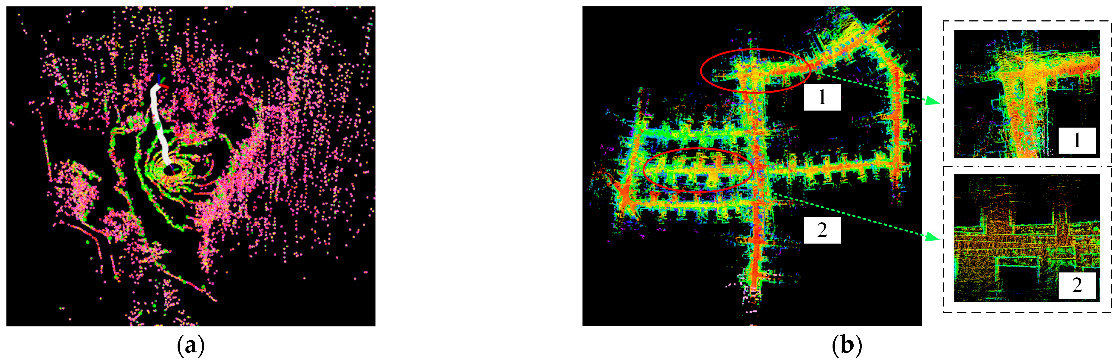 Figure 18, the mapping results of our method did not show large or obvious drift, and the local mapping results can clearly show the environmental structure and details when enlarged. Among them,