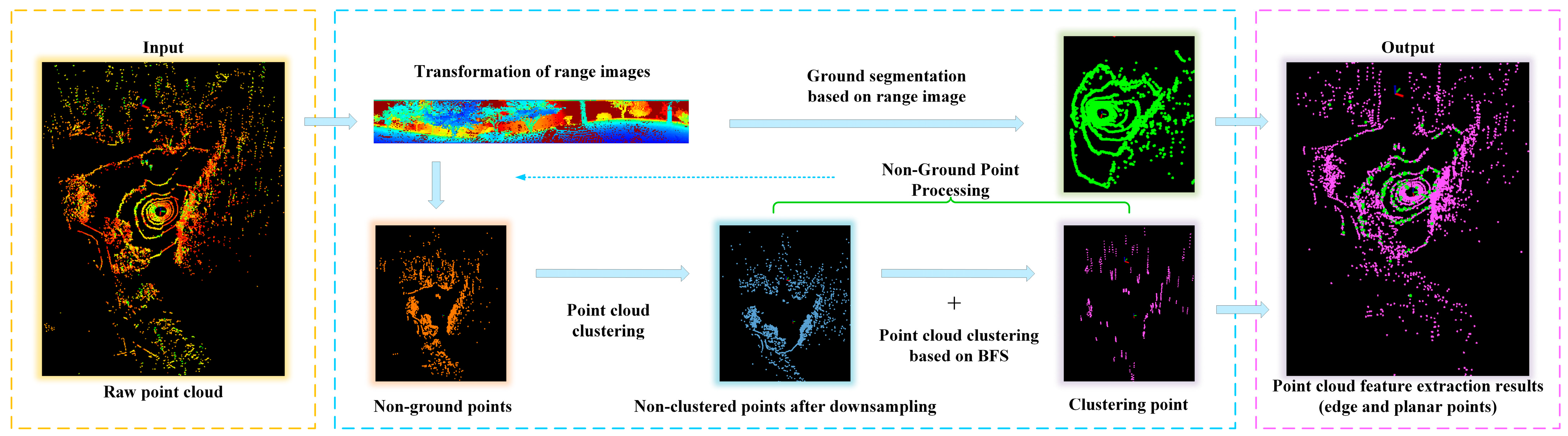 We used the BFS algorithm to cluster and segment the non-ground points and found the point cloud with the same label by traversing layer by layer, which improved the clustering speed of the point cloud, avoided the larger computation brought by the global search, and established the foundation for the lightweight front end of the algorithm.