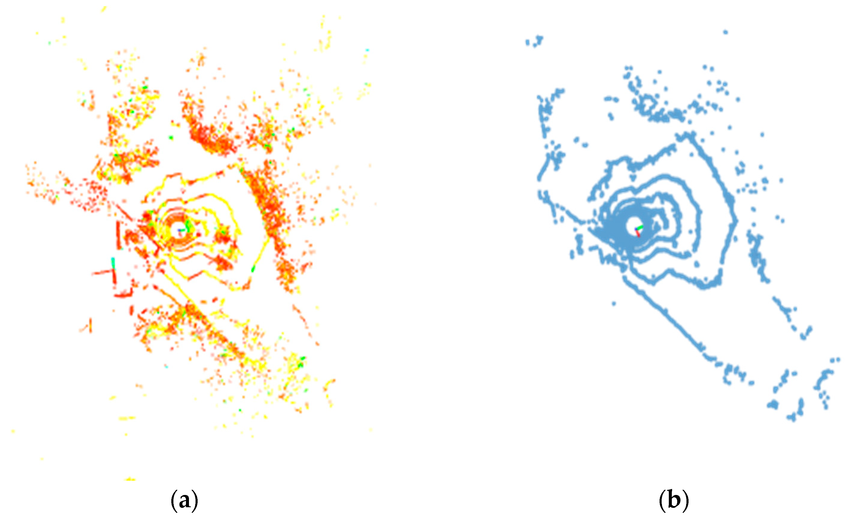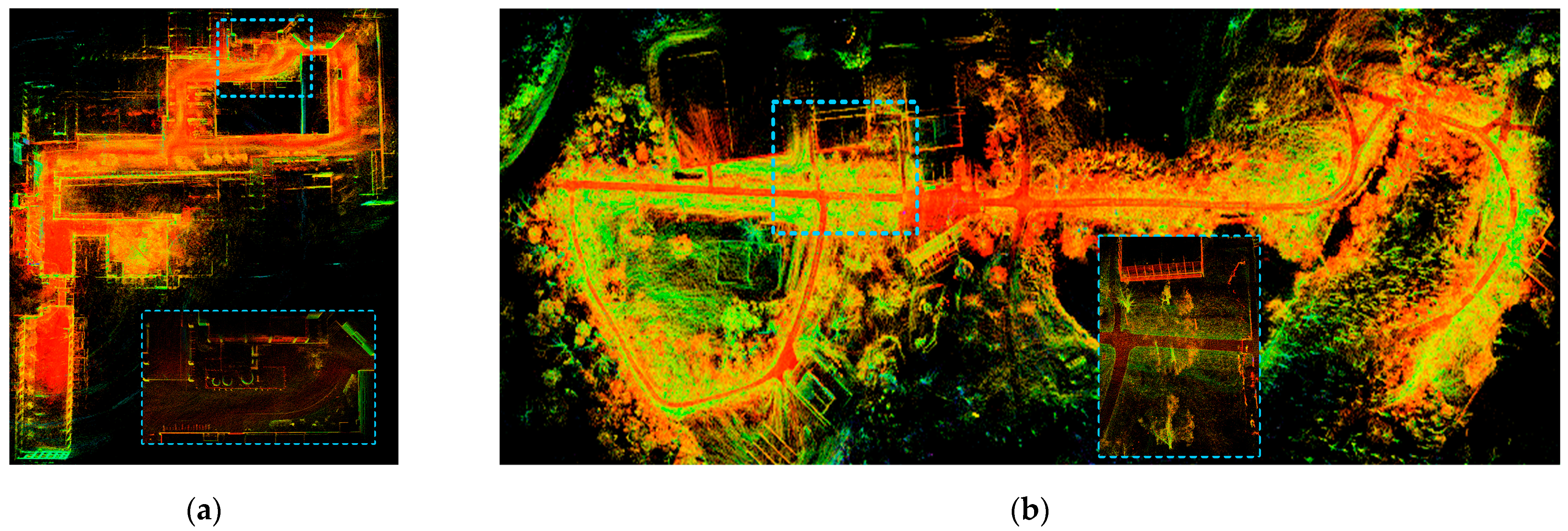 Figure 18a can show clear localized building structures when compared with the results of LOAM, LIOM, and LIO-SAM mapping in the literature [