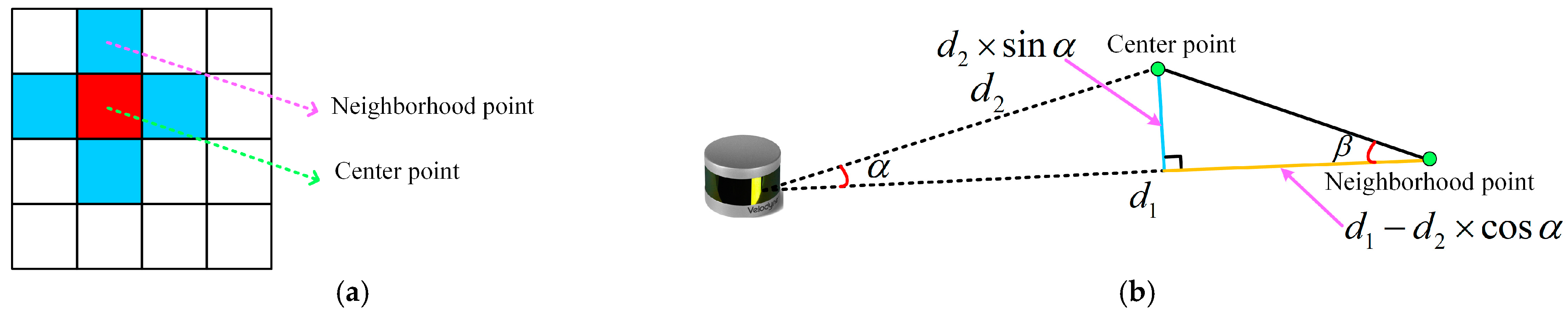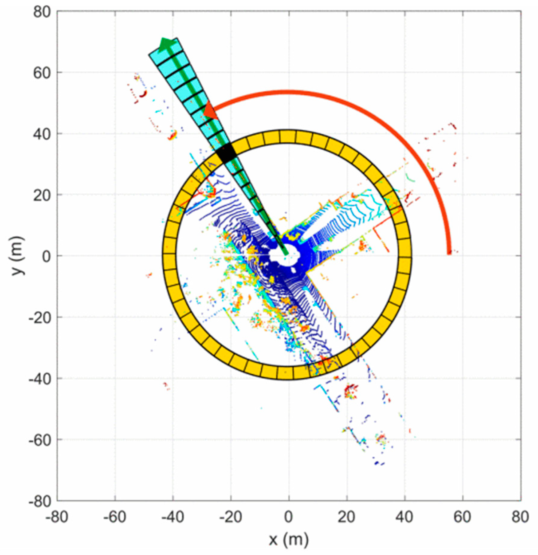 28]. The outdoor scene is large in scale, and the amount of point cloud data acquired by LiDAR is large. When using the RANSAC method for ground point cloud segmentation, the computational efficiency is low and easily falls into the local optimum, the algorithm is time-consuming, and at the same time, it is difficult to obtain ideal segmentation results. Then, we used the BFS method to cluster and label the non-ground points [