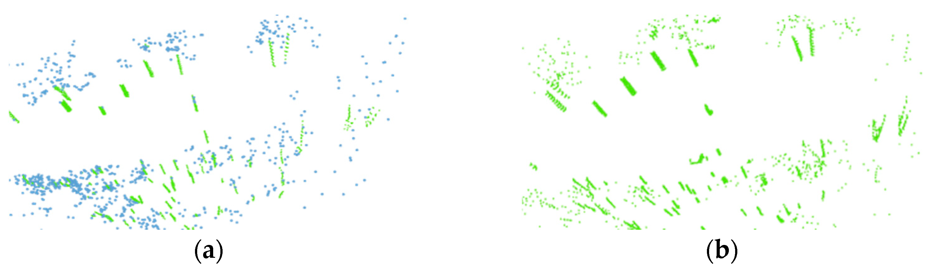 Figure 1a, the feature point cloud is extracted directly by curvature calculation, and the result is very rough and cluttered. Moreover, due to the large scale of outdoor scenes, traditional loop closure detection methods based on odometry-measured distances (e.g., the RNN algorithm) are likely to produce cumulative drift and loop closure failures. As shown in