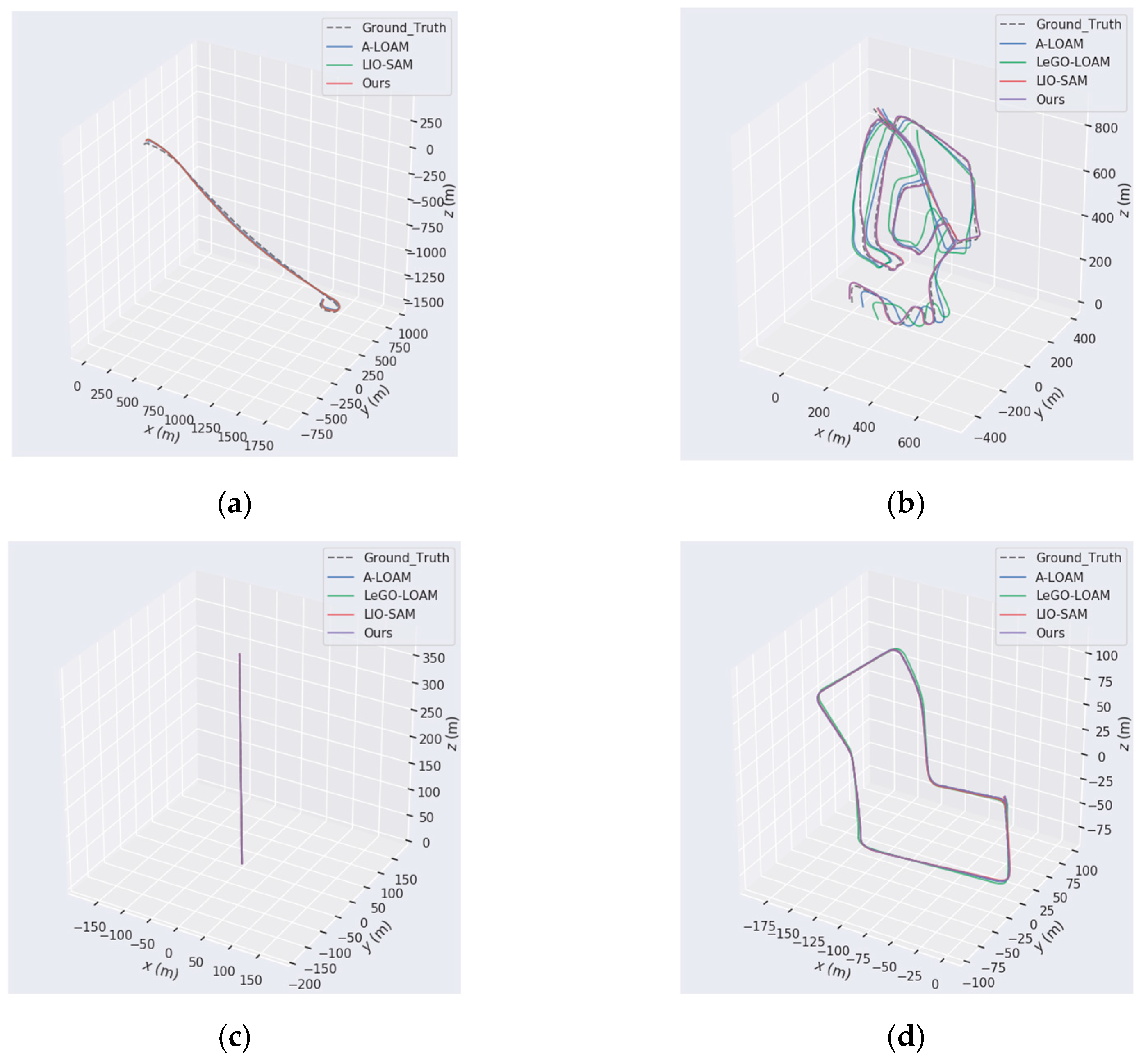 Figure 15, compared with A-LOAM, LeGO-LOAM, and LIO-SAM algorithms, the overall match between the trajectories estimated by our method and the ground truth of the dataset was higher, and the fitting results were better. The LeGO-LOAM algorithm data were not counted in