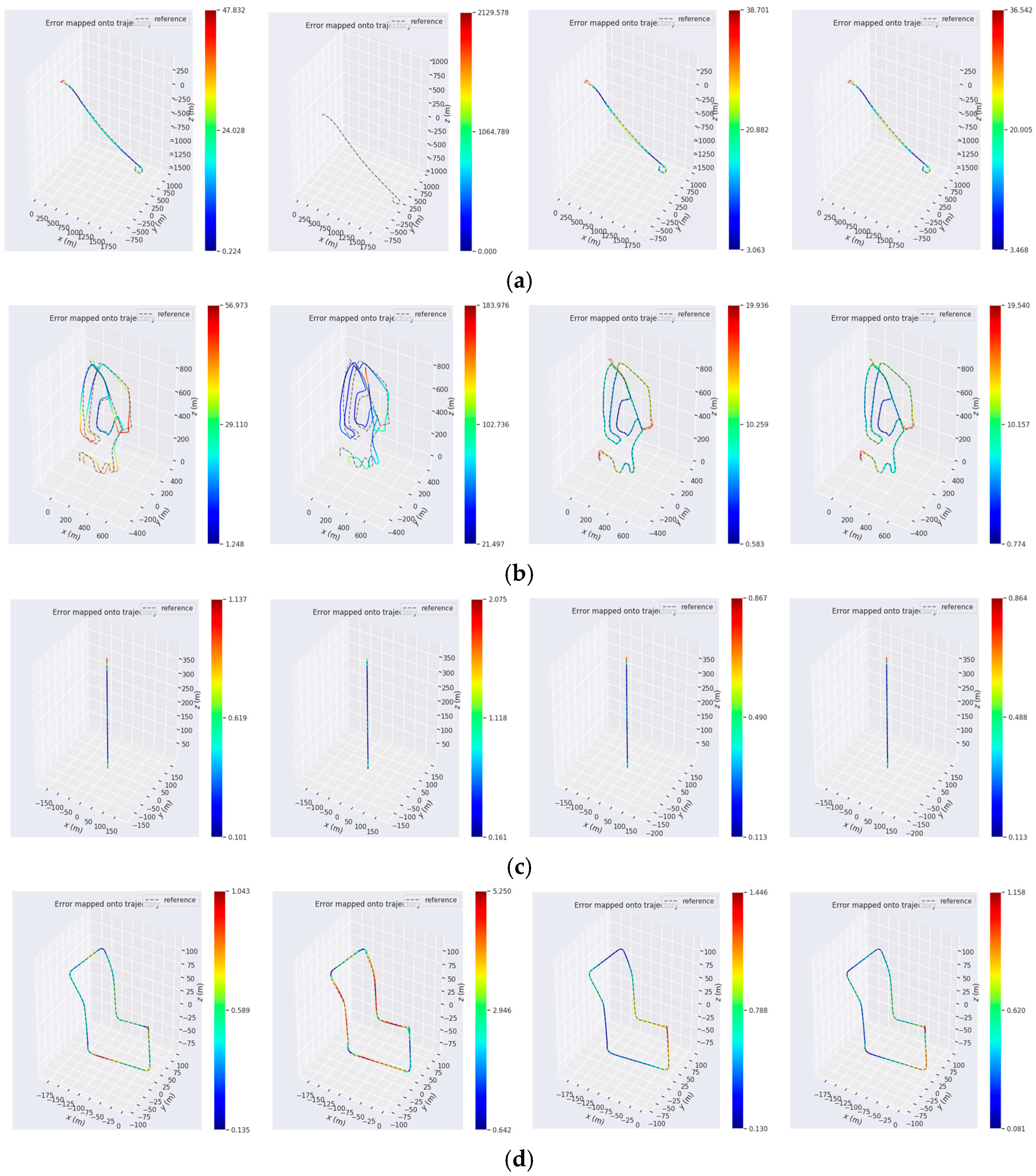 Figure 16, our algorithm obtained the smallest ATE.Max results in the KITTI-0042, KITTI-0034, and KITTI-0016 datasets, which were 36.54 m, 19.54 m, and 0.864 m, respectively. It can be seen by fitting the color results with the ground truth that the algorithm in this paper had a better overall fit with the ground truth and a lower error level compared with the A-LOAM, LeGO-LOAM, and LIO-SAM algorithms. It directly illustrates that the algorithm in this paper was much closer to the ground truth, and the maximal error was smaller. The ATE error data are shown in