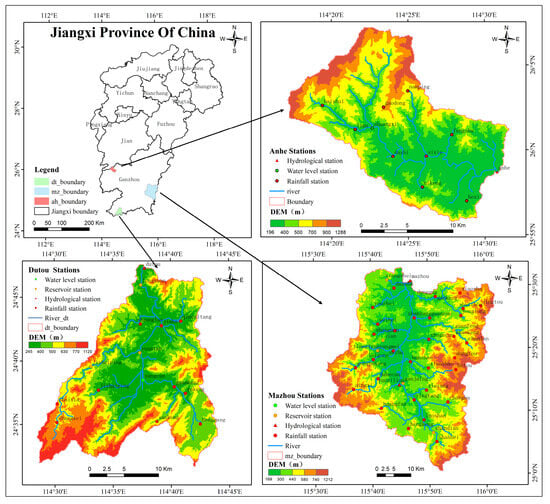 The Anhe, Dutou, and Mazhou watersheds in Ganzhou City, Jiangxi Province, China, were selected to evaluate the applicability of the Liuxihe model and assess the impact of different DEM resolutions on flood simulation. These watersheds, located in the upper reaches of the Gan River (a primary tributary of the Yangtze River), feature mountainous and hilly topography and experience a subtropical monsoon climate with abundant rainfall and a long frost-free period. During summer, influenced by the southwestern airflow at the edge of the subtropical high-pressure system, the region receives significant and concentrated rainfall and is also susceptible to typhoon-induced precipitation.