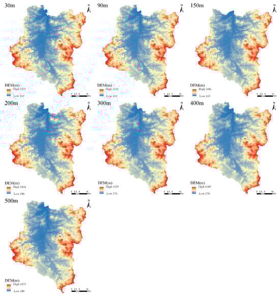 ASTER GDEM data, jointly developed by METI (Japan) and NASA (USA), are based on ASTER data calculations. ASTER GDEM3, an improved version using advanced algorithms, enhances the accuracy of its predecessors, V1 and V2. In contrast, the SRTM DEM, jointly developed by NASA and the National Mapping Agency, has been publicly available since 2003, with SRTM3 providing 90 m resolution data. Both datasets are freely accessible via http://www.gscloud.cn (accessed on 1 April 2024) and have been widely utilized in related studies. For this research, the 90 m resolution SRTM3 was chosen for DEM data in flood simulations using the Liuxihe model for the three watersheds. ASTER GDEM3 was selected for the 30 m resolution DEM, and DEMs with 150 m, 200 m, 300 m, 400 m, and 500 m resolutions were generated by resampling the SRTM3 data, the resampling method using bilinear interpolation [,]. Table 1 and Figure 2 displays the characteristics and spatial distribution of the Mazhou watershed under different DEM resolutions.