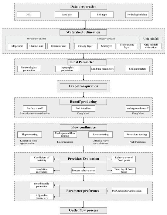 Flooding is one of the natural disasters with the heaviest impacts and losses, posing a major threat to the safety of people’s lives and property, while severely restricting local economic development [,,]. Flood forecasting is simulating the future flood process according to the law of flood generation and movement, which is an important content of the current flood control non-engineering measures [,,]. Watershed hydrological modeling is the mainstream method for flood forecasting [,], and hydrological models can be divided into lumped, semi-distributed and fully distributed physically hydrological models according to the stage of development [,]. The structure of lumped models is relatively simple, with representative models such as the Stanford model [], the HBV model [], the Sac model [], the Xin’an Jiang model [], etc. Semi-distributed hydrological models consider dividing the whole watershed into cells, but the cell grids are large, with representative models such as TOPMODEL [], SWAT [] and HEC-HMS []. In recent years, with the breakthroughs in computer technology, RS technology, GIS technology and radar rainfall measurement technology, physically based distributed hydrological models (PBDHMs) have been rapidly developed, which have obvious advantages in the theoretical basis of refined runoff simulation because of their strict physical mechanisms. It is an inevitable trend for the development of watershed hydrological stimulation in the future, and the representative models are the SHE model [], the VFLO model [], the VIC model [], and the Liuxihe model [], etc.
