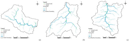 For modeling with the Liuxihe model in the three watersheds, we utilized the 90 m SRTM3 DEM as an example. First, land use and soil data were resampled to 90 m resolution and unified within the same projected coordinate system. The three watersheds were then subdivided into unit watersheds based on the DEM data. These unit watersheds were classified into slope units, channel units, and reservoir units using the D8 streamflow method []. The river channel units were defined by setting a cumulative flow threshold, while other units were designated as side slope units, as there are no medium or large reservoirs in the study areas. The extracted river channels were categorized into three levels using the Strahler method []. The virtual river channels were segmented at each level, taking into account the actual river morphology. For each segment, the dimensions of the cross sections were estimated, including the bottom width, bottom slope, and side slope sizes. The bottom width of the river channels was determined from remote sensing imagery, measuring the width between riverbanks. The bottom slope was estimated based on the elevation difference between the upper and lower junctions of the virtual river channel and the length of the river segment. The side slopes were approximated using the slopes of the adjacent side slope units. Table 5 and Figure 6 show the delineation of water systems in the three watersheds.