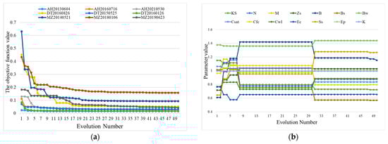 Results of parameter optimization of the Liuxihe model with the particle swarm optimization (PSO) algorithm: (a) changing curve of the objective function in 9 floods; (b) parameter evolution process for 20130721 in Anhe watershed.