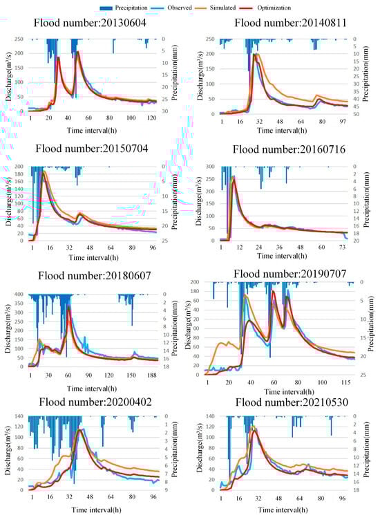 After optimizing the parameters for the Anhe watershed, the simulation results (Table 9 and Figure 8) for all eight floods showed a Nash–Sutcliffe efficiency coefficient exceeding 0.85 and a correlation coefficient surpassing 0.9. The process relative error was constrained to 0.3, the relative error of flood peaks was limited to 0.1, and the peak occurrence time was restricted to within 3 h. The significant enhancement in flood simulation accuracy of the Liuxihe model due to parameter optimization is evident. Notable improvements were observed even for the challenging multi-peak flood event on 7 July 2019. The coefficient of certainty for parameter preference increased from 0.309 to 0.903, the correlation coefficient from 0.799 to 0.954, the process relative error reduced from 1.182 to 0.214, the flood error diminished from 0.156 to 0.013, and the difference in peak occurrence time decreased from 5 to 2 h.