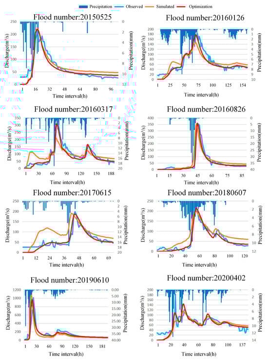 Through the above modeling process and parameter optimization of the Liuxihe model, the flood simulation results of eight sub-flood processes in the Anhe watershed, eight sub-flood processes in the Dutou watershed, and six sub-flood processes in the Mazhou watershed were obtained with a 90 m-resolution DEM as the substrate, respectively.