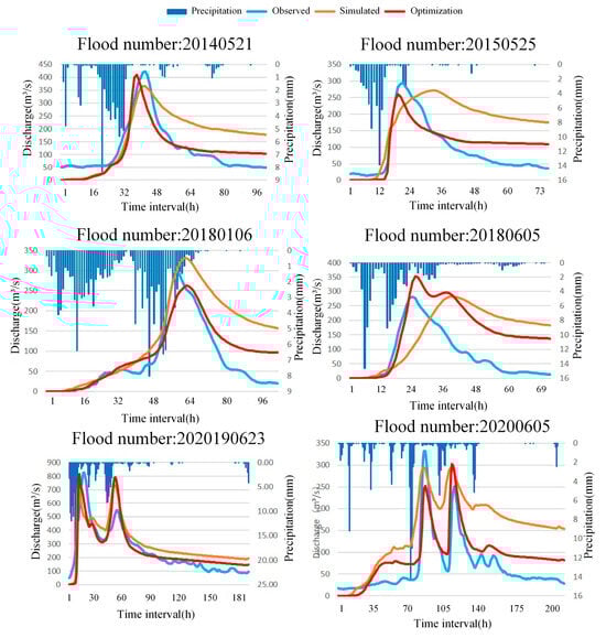 As shown in the Table 11 and Figure 10, after optimizing the parameters for the Mazhou watershed, the Nash–Sutcliffe efficiency coefficient for four out of six floods exceeded 0.75, the correlation coefficient surpassed 0.8, the relative errors of flood peaks were all constrained within 0.1, and the differences in the time of occurrence of flood peaks were all controlled within 2 h.