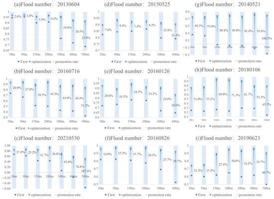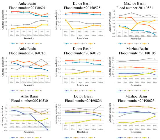 To study the effects of different DEM resolutions on flood simulation results, we selected nine floods from the Anhe (20130604, 20160716, 20210530), Dutou (20150525, 20160126, 20160826), and Mazhou watersheds (20140521, 20180106, 20190623). The original 90 m-resolution DEM was sequentially resampled to 150 m, 200 m, 300 m, 400 m, and 500 m, resulting in seven spatial resolution DEMs ranging from 30 m to 500 m used as input data for the Liuxihe model’s flood simulation. Notably, in the Dutou watershed, when the DEM resolution was resampled to 500 m, it was not possible to extract information about the river where the hydrological station at the watershed outlet was located. Therefore, the highest resolution used for the Dutou watershed was 400 m. Figure 11 illustrates the changes in flood modeling accuracy across different DEM resolutions.