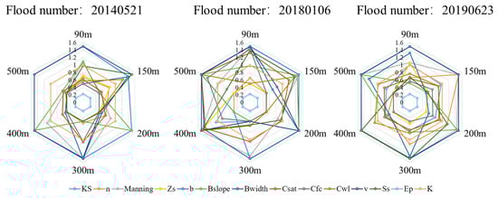 Due to space limitations, we use the Mazhou watershed as an example to demonstrate changes in the model’s optimal parameters at various resolutions, from 90 m to 500 m, for the 20140521, 20180106, and 20190623 floods after parameter optimization. The results indicate that some model parameters vary with resolution when achieving optimal simulation for the same flood event. Figure 13 illustrates that some model parameters change when achieving the best simulation results for the same flood event at different resolutions. This indicates a scale effect on parameter values, where parameters closely related to resolution, such as river bottom slope and river roughness, are more likely to vary. The range of parameter values varies with changes in DEM resolution, with variation intervals consistently between 0.5 and 1.5.