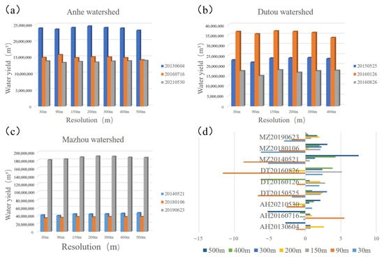 The results in Figure 14 indicated that the magnitude of flood production across different DEM resolutions is similar, and the statistical analysis of 60 flow production results showed an error range within ±10% for 59 and ±5% for 50.