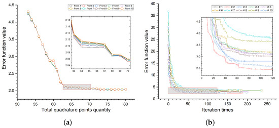 Convergence results of the NSGA2 method: (a) the foremost 10 Pareto front results, (b) convergence iteration process of 10 random grouping strategy combinations.