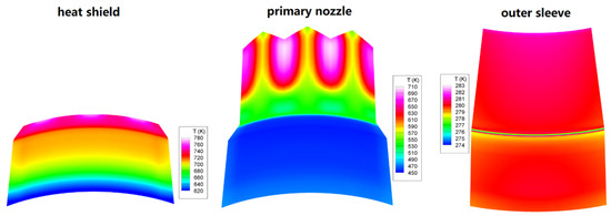 Temperature (T) distribution of the solid part of the large-sized exhaust system with a cooling structure.