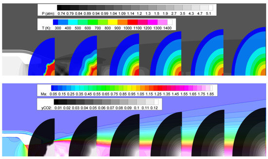 Distribution of temperature (T), pressure (p), carbon dioxide mass fraction (), and Mach number () in the meridional and axial sections of the fluid field of the small-sized exhaust system without a cooling structure.