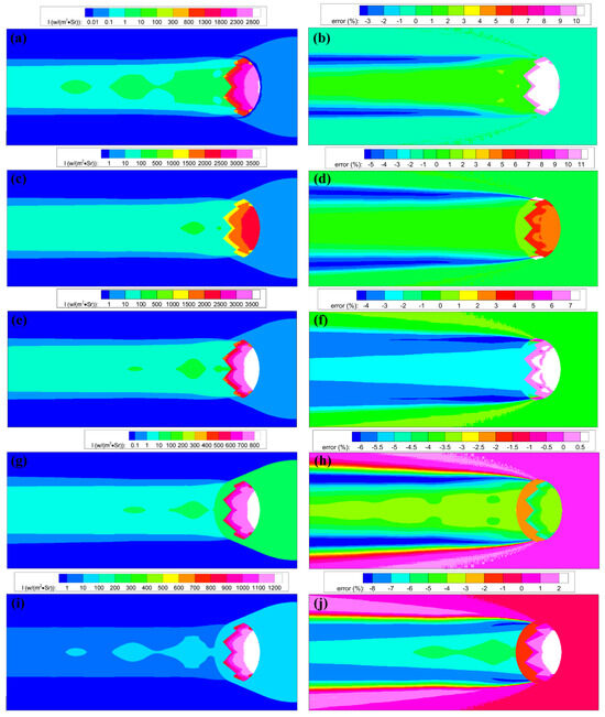 Remote infrared imaging of the large-sized exhaust system with a cooling structure in different atmospheric window bands (left), and the distribution of calculation errors of the optimized MSMGWB model (right), (a,b) 2~2.5 m band, (c,d) 3.7~4.8 m band, (e,f) 3~5 m band, (g,h) 7.7~9.7 m band, (i,j) 8~14 m band.