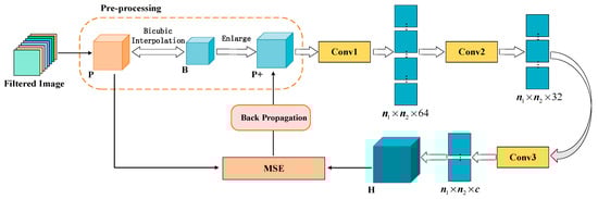 The image enhancement module with 2DCNNs. During the pre-processing stage, the input image cube P is first reduced by a certain proportion through bicubic interpolation and obtains a smaller image cube B, which is enlarged and restored to image P+ with the same size as the original input P. The three 2D convolution layers with different sizes of convolution kernels after the pre-processing sequentially enhance the spatial information with the reconstruction of image P+; thus, the output H has higher spatial resolution compared to input image P. We take mean square error (MSE) as the loss function for back propagation and parameter update.