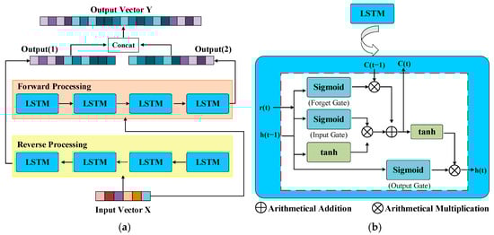 The specific structure of BiLSTM and LSTM. In BiLSTM, forward and reverse LSTMs perform spectral feature extraction on the input vector in both front and back directions. Output (1) and Output (2) are the output feature vectors of the reverse processing and the forward processing, respectively, which will be concatenated as the final output feature vector Y. LSTM is mainly composed of the forget gate, input gate, and output gate, which are combinations of the sigmoid and tanh functions. Input h (t − 1) means the output of the last cell, and h (t) is the output we need. C (t−1) adds the memory state of the last cell and is updated to C (t) as an output, and r (t) is the input of the current cell. (a) BiLSTM; (b) LSTM.