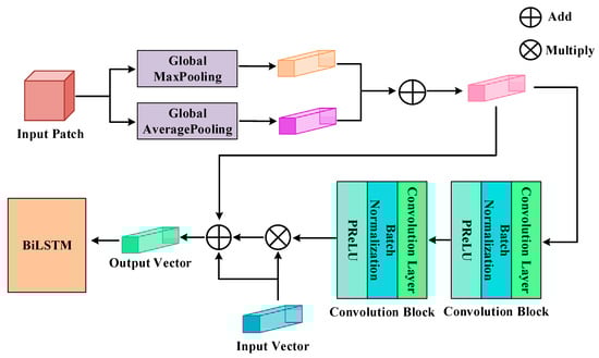 The structure of the attention mechanism. We add the output vectors after the input patch goes through a two-branch pooling process to combine the global and local spectral information. Then, there are two convolution blocks for the attention weight which will be multiplied by the input vector transformed into a sequence. By synthesizing the pooled sequence after addition and the input vector before and after weight processing, we obtain the output vector for the process of BiLSTM.