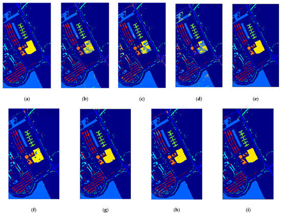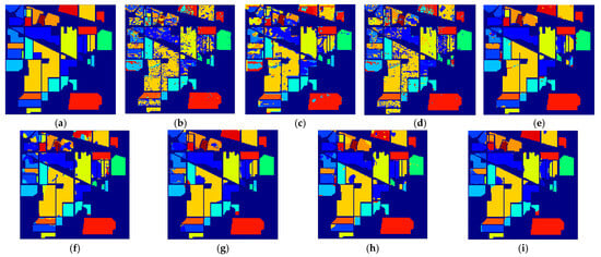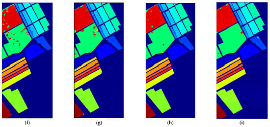 The IP dataset was captured at the Indian Pine test site in northwest Indian, including 224 spectral reflection bands with the size of 145 × 145, and the wavelength range was 0.4~2.5 μm. The existing ground-truth are divided into 16 classes, and are not entirely mutually exclusive. UP dataset was obtained during an air race over Pavia in northern Italy, including 115 spectral reflection bands with the size of 610 × 340. The existing ground-truth are divided into 9 classes, including trees, bricks, meadows, and so on. As for SS dataset, the scene was captured by a 224-band sensor over the Salinas Valley in California, featuring a high spatial resolution. As in the Indian Pines scene, 20 water absorption bands were discarded. The existing ground-truth are divided into 16 classes, with 54,129 samples in total. More detailed information about these datasets is described in [56].