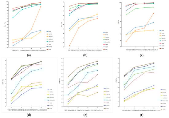 The curves of OA values of IFEE and other methods using two different ways of selecting training samples. (a–c) Curves with different proportions of training samples in three datasets. (d–f) Curves with a different number of training samples in each class in three datasets. (a) Different proportions of training samples in IP. (b) Different proportions of training samples in UP. (c) Different proportions of training samples in SS. (d) Different numbers of training samples in each class in IP. (e) A different number of training samples in each class in UP. (f) Different numbers of training samples in each class in SS.