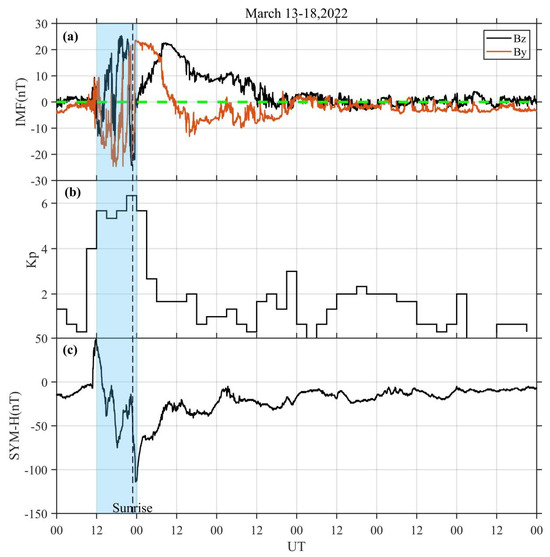 Geomagnetic conditions for 13–18 March 2022: (a) the By and Bz components of the interplanetary magnetic field observed by ACE, (b) 3 hr Kp index, and (c) SYM-H. The blue shaded area indicates the main phase of the magnetic storm, and the black dashed line indicates the local sunrise time at ground level in Sanya.