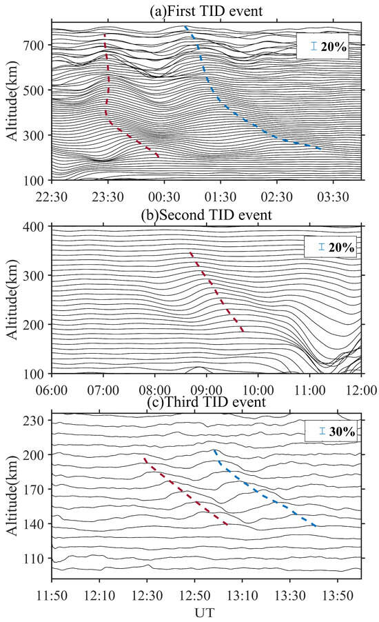 A time series profile of relative electron density perturbations at different altitudes for the three TID events. (a) The first TID event. The altitude sampling interval is 10 km. The blue and red dashed lines indicate the phase fronts. (b) The second TID event. The altitude sampling interval is 10 km. (c) The third TID event. The altitude sampling interval is 9 km. The mark at the top right corner is the relative amplitude scale.