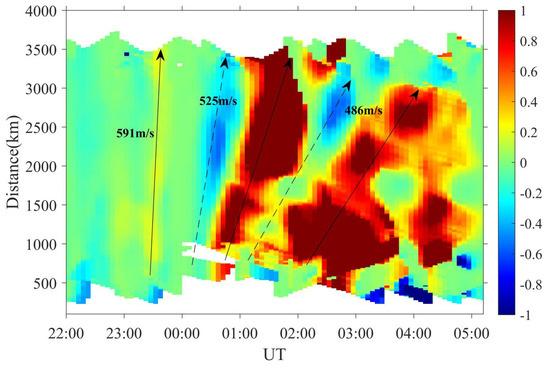 The black solid line in Figure 6 represents the phase lines of the group B TID events. These TIDs propagated southeastward with an azimuth of ~169° to 172°. The keogram shown in Figure 6 provides detailed information on the components of the propagation of these TIDs. The wavefronts in the keogram formed nearly continuous lines, exhibiting well-organized periodicity with an average period of 136.2 ± 11.8 min, which is consistent with the first TID event observed by the SYISR. The first two persistent positive fronts, moving at a horizontal velocity of 587.14 ± 71.11 m/s, cover an extensive region exceeding 3500 km in the slice shown (Figure 1). After 01:50 UT, the group C TID emerged in northeastern China with an amplitude of ~2.6 TECU. This TID propagated toward the southwest with a lower horizontal phase velocity of ~440.97 ± 47.78 m/s (Figure 5g–i). This TID group experienced significant attenuation during propagation, decreasing to less than 50% of the maximum amplitude after covering ~1200 km and eventually dissipating almost entirely after reaching ~3050 km (Figure 6). The above multi-wave process may have led to the expansion of and enhancement in the band structure (Figure 5d–f) at low latitudes, which is a common phenomenon during storm at that latitude [16].