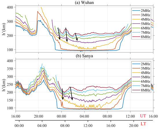 Temporal variations in virtual height, at detection frequencies ranging from 2 to 8 MHz, with a step of 1 MHz, recorded by the ionosonde chain in China on 13–14 March 2022. Frequencies are shown on each curve. The frequencies and virtual heights were read from the F-layer trace in the ionograms recorded by ionosondes in (a) Wuhan (30.5°N) and (b) Sanya (18.3°N). The time resolution is 7.5 min. The black arrow lines in each plot connect the peaks of variation at different frequencies.