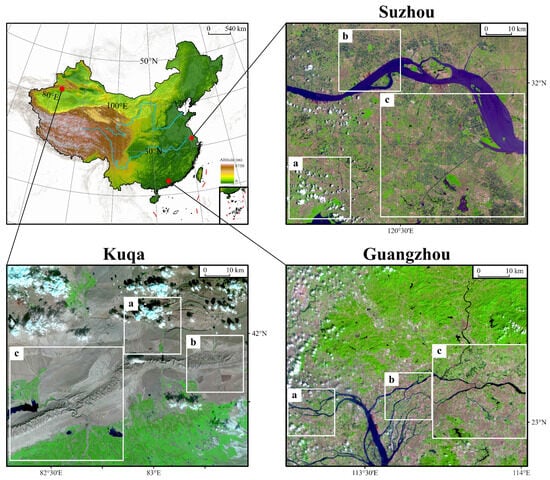 There are often various ground objects in RS images. To validate the universality of our method, Suzhou (vegetation-dominated area), Kuqa (bare-land-dominated area), and Guangzhou (urban-dominated area) in China are selected as study areas. Two common RS satellite sensors (Landsat 8-9 OLI-TIRS and Sentinel-2 MSI) are applied for the experiments. Each area is divided into an application area, a simulation area, and a training area for the deep-learning methods (Figure 2). The experiments choose the shortwave infrared band (SWIR), the near-infrared band (NIR), and the red band (RED) as examples for restoration, which are often used in RS false-color composites. The details of the datasets can be seen in Table 1.