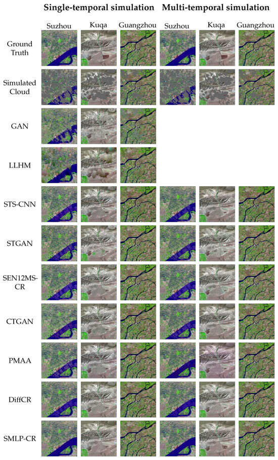 Simulation results of SMLP-CR and comparison methods. The results show false-color composite RS images using SWIR, NIR, and RED bands.