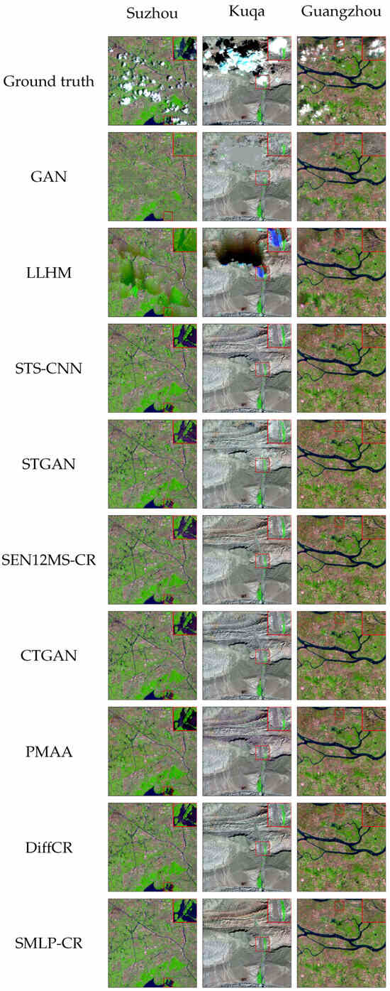 The reconstruction of cloud-covered areas in the application area is shown in Figure 5. There is significant spectral distortion in the restoration results of GAN and LLHM. Further, it can be seen in the Suzhou dataset that deep-learning methods produce purple artifacts when reconstructing water pixels, but the result of SMLP-CR exhibits lower spectral distortion. For the Kuqa dataset, SMLP-CR demonstrates notably superior color consistency in the oasis through the details of Figure 5. Comparative methods show varying degrees of texture discontinuity in the details of Figure 5 when restoring images form the Guangzhou dataset. In contrast, SMLP-CR demonstrates stronger texture continuity. Therefore, SMLP-CR performs better at reducing spectral distortion, maintaining color consistency, ensuring texture continuity, and restoring image details.