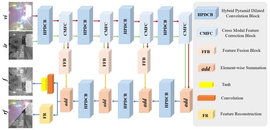 Image fusion technology can generate high-quality fusion images containing rich detail information by integrating two or more source images [1,2]. This technology covers various image types, including medical image fusion (MIF), multi-exposure image fusion (MEIF), and infrared–visible image fusion (IVIF). The main goal is to provide a clear and comprehensive scene representation to enhance scene understanding. Among them, IVIF is the most widespread and challenging since it requires the effective extraction and combination of cross-modal features from different sensors. The core goal of IVIF is to retain the abundant texture details from the visible image and the salient target from the infrared image [3]. By fusing these two, it can avoid problems caused by the low resolution and noise of infrared images, and simultaneously overcome the limitations of visible images in harsh working environments (such as rain, snow, fog, low illumination, etc.). High-quality fusion images are very helpful for downstream high-level visual tasks, including remote sensing [4], object detection [5], image segmentation [6], and autonomous driving [7].