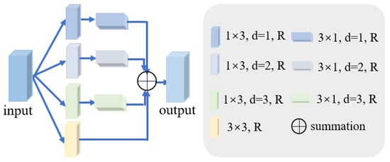 where denotes the input feature, d denotes dilation rate, stands for ReLU activation function, stands for convolution, h is the output feature, and and are the kernel sizes.