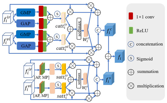 Assuming the i-th HPDCB of the visible and infrared branches generate and , respectively, we first adopt GAP and GMP to obtain global features. Subsequently, after a series of processing, the channel attention weights generated by the infrared and visible branches are obtained. These attention weights are then multiplied with the corresponding input features , aiding the model in suppressing unimportant scene features and emphasizing crucial ones. Following this, the attention weights of these two branches are added; then, the softmax function is employed to acquire the cross-channel attention weight . The multiplication of the input features and weight of the visible and infrared images yields the cross-channel attention output for both modalities. Additionally, and undergo a spatial attention module (composed of MP, AP, convolution, and sigmoid function), producing the spatial attention output for the visible and infrared images. Subsequent operations are similar to the above process (see Figure 5). The final cross-modal fusion feature is acquired by adding the acquired and . The process mentioned above can be formulated as follows: