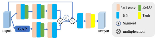 where B denotes batch normalization, stands for convolution with kernel size , stands for ReLU activation function, represent global average pooling, and is Tanh activation function.