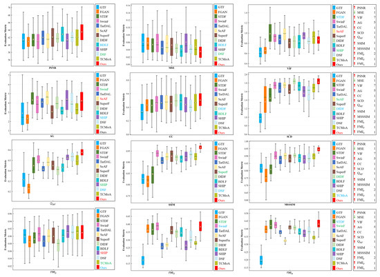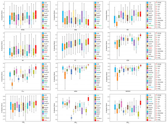 Evaluation metrics. Given the deficiency of ground truth in IVIF, it is insufficient to rely solely on subjective visual assessments to evaluate the quality of fusion images, particularly when the two fusion images are nearly indistinguishable visually. To make the results more convincing, we select twelve quantitative metrics to comprehensively and objectively evaluate our method, including the sum of the correlation differences (SCD) [53], correlation coefficient (CC) [54], average gradient (AG) [55], visual information fidelity (VIF) [56], mean square error (MSE) [57], peak signal-to-noise ratio (PSNR) [58], edge information () [59], multi-scale structural similarity (MSSSIM) [60], structural similarity (SSIM) [61], mutual information (based on wavelet feature (), discrete cosine feature (), and pixel feature ()) [62]. Except for MSE, higher values indicate superior fusion performance.