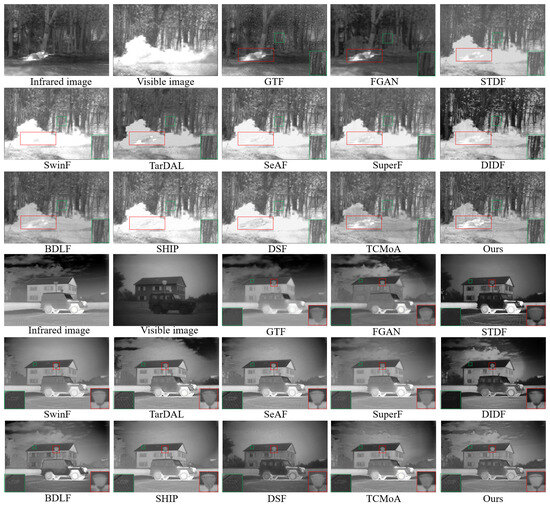 Qualitative analysis. We compare our method against twelve SOTA fusion methods to assess its generalization performance and robustness. Figure 9 presents the fusion results of two representative scenes: one is a smoke scene and the other is a daytime scene with low illumination. To facilitate the observation of the fusion results, we use red and green rectangles to mark some significant targets and texture detail information, respectively, in Figure 9. As observed in Figure 9, all methods can complete the basic fusion task. However, our method exhibits remarkable performance in subjective visual quality and retaining the crucial features in the source image. The fusion images generated by GTF and FGAN tend to infrared images, preserving the significant targets from the infrared images; nevertheless, they fail to integrate the texture detail from the visible images. STDF, SwinF, TarDAL, SeAF, SuperF, DIDF, BDLF, SHIP, and DSF can retain plentiful texture details from the visible images but insufficiently maintain significant targets from the infrared images. TCMoA can maintain the prominent targets from the infrared images and the texture details from the visible images but suffers from low contrast. In comparison, our method has satisfactory visual quality while retaining abundant texture detail from visible images and significant targets from infrared images.