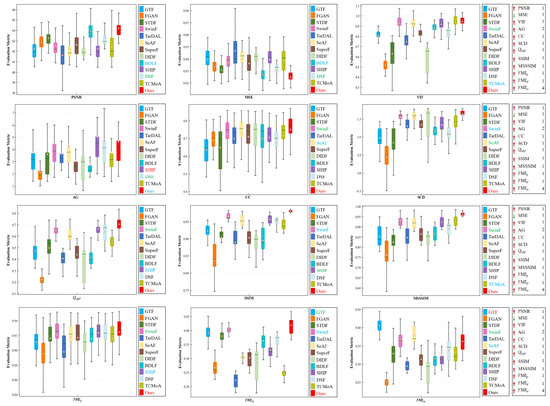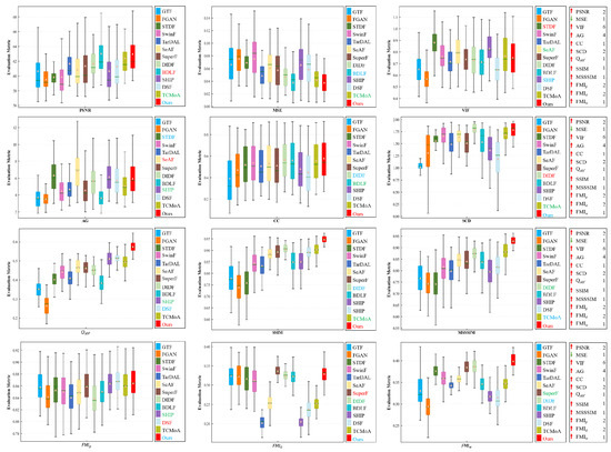 Quantitative analysis of multiple evaluation metrics on the dataset. Within each box, the green line indicates the median value, and the orange tangle stands for the mean value. Red serves to highlight the best mean value, blue for the second-best, and green for the third-best. The rankings of the proposed method for each metric are displayed on the right.