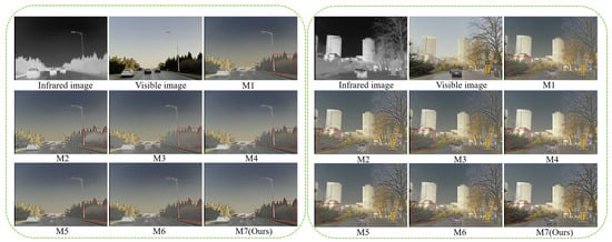 Qualitative analysis. Figure 15 presents the qualitative results of two groups of ablation experiments. It is evident from the displayed results that the fusion results of M1, M2, M3, and M4 exhibit some blurring, while the contrast of M5 and M6 is also lower compared to our method. Generally speaking, our method excels in maintaining high contrast and complete information while also demonstrating excellent clarity compared to other incomplete combination modules.
