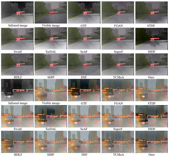 Figure 1 demonstrates the fusion and detection results in a typical smoke scenario. In such conditions, humans and other important targets are often obscured by smoke. Nonetheless, owing to the unique imaging principles inherent to infrared images, they can penetrate smoke and distinctly reveal these targets. As illustrated in Figure 1, the fusion image significantly enhances the visibility of targets in smoky conditions, thereby improving detection accuracy. For target detection, visible images fail to detect critical targets obscured by smoke. The FGAN [8] misses critical target detections, while the DSF [9] results in false detections. SuperF [10] and the proposed method both successfully detected these targets, with our method having higher detection accuracy. This indicates that the proposed method efficiently integrates useful information from infrared and visible images, enhancing subsequent target detection accuracy. IVIF has tremendous potential for applications in remote sensing, especially in monitoring complex environments. For example, in forest fire monitoring, IVIF can help identify fire sources and hotspot areas, clearly showing the location and range of the fire, which is very helpful for decision-makers in formulating more effective rescue plans.