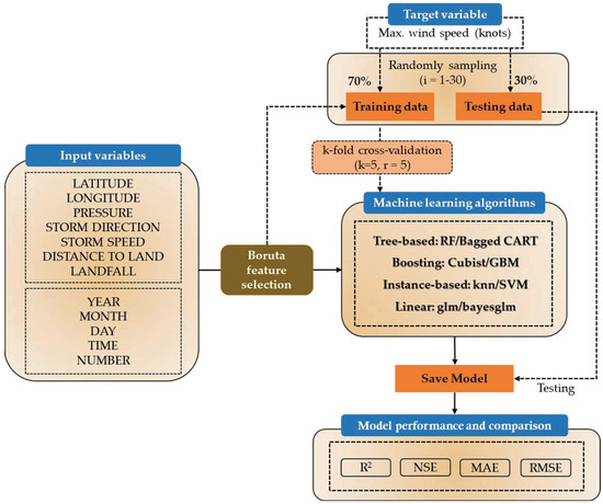 The 12 predictors utilized in this study are latitude, longitude, pressure, storm direction, storm speed, distance to land, landfall, year, month, day, time, and number. This list is also depicted in Figure 2. The time feature was eliminated by Boruta feature selection. Therefore, we have 11 predictors as inputs to ML models. The dataset was partitioned into two sets using a 70/30 split, a common ratio employed in many studies. Table 1 summarizes the distribution of training and testing data across different phases of the ENSO. It shows the number of data points used for training and testing models under Neutral phase, El Niño (or Warm phase), and La Niña (or Cold phase) conditions, with a total of 24,485 data points allocated for analysis. The entire process was iterated thirty times to ensure model stability and facilitate comparisons between models. The training data underwent modeling with k-fold cross-validation, where the number of folds (k) was set to 5 and the process was repeated 5 times (r).