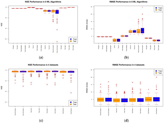 This section examines the performance of 32 model instances for estimating intensity, focusing on metrics such as NSE and RMSE. These metrics are derived from a comprehensive analysis involving 30 runs per model, resulting in a total of 120 data points across Figure 3a,b. Figure 3c,d provide a detailed summary of the results from the NSE and RMSE analyses, respectively, categorized by datasets (All Centers, Cold, Warm, and Neutral phases).