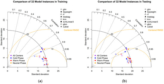 Taylor diagram performance comparison of 32 model instances during the (a) training phase and (b) testing phase.