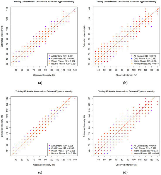 Other techniques for typhoon intensity estimation include methods leveraging satellite observations and traditional techniques like the Dvorak method. Studies such as those by Xiang et al. [40] and Sakuragi et al. [41] used satellite data, but their RMSE values, ranging from 5.94 to 7.27 m/s (11.55 to 14.3 knots), indicate greater estimation errors. Ritchie et al. [42] utilized the deviation-angle variance technique, yielding RMSEs of 7.27 m/s (14.3 knots). Infrared satellite image-based methods also yielded higher errors, with Zhang et al. [19], Lu and Yu [43], and Zhao et al. [44] reporting RMSE values between 6.18 and 7.30 m/s (12.01 and 14.19 knots). Traditional approaches like the ADT and its AI-enhanced variant (AiDT) still exhibit higher errors than the machine learning models used in the current study, further emphasizing the superior performance of the Cubist and RF models. Ryu et al. [45] used the ADT, reporting an RMSE of 4.39 m/s (8.53 knots). Olander et al. [18] enhanced the ADT with artificial intelligence, referred to as AiDT, improving the RMSE to 3.76 m/s (7.30 knots).