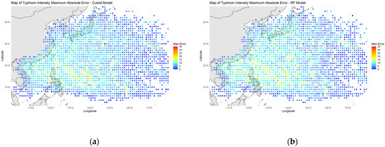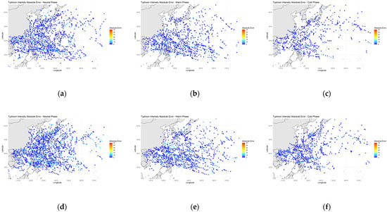 These images depict the absolute error distribution for typhoon intensity forecasts using Cubist-based models in the WNP region. Each image represents a different dataset or climatological phase used for testing the models. The blue points indicate forecast errors, with lighter shades of blue representing higher errors. Additionally, yellow and orange points highlight areas with even higher forecast errors compared to the light blue regions. In the map of the maximum absolute error of the Cubist and RF models (Figure 6a,b), which includes all tracks, the highest errors are concentrated around the Philippine archipelago, particularly the northern islands like Luzon, as well as in the South China Sea and East China Sea regions. Some yellow and orange points can be seen in these areas, indicating the most significant forecast challenges.