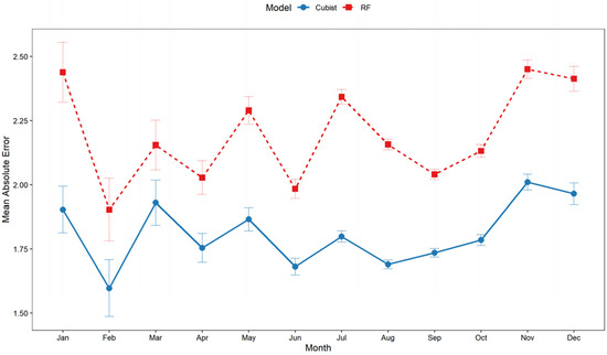 For the RF model, the highest MAE is observed in January and November, with values around 2.4. The Cubist model peaks in November with an MAE around 2.0. Wider confidence intervals, like in February for Cubist, indicate higher uncertainty in error estimates. Narrower intervals, like in August for RF, suggest more consistent errors. Overall, the Cubist model consistently shows lower MAE values compared to the RF model throughout the year. Cubist’s lowest MAE of approximately 1.75 occurs in February (as shown in Figure 8).